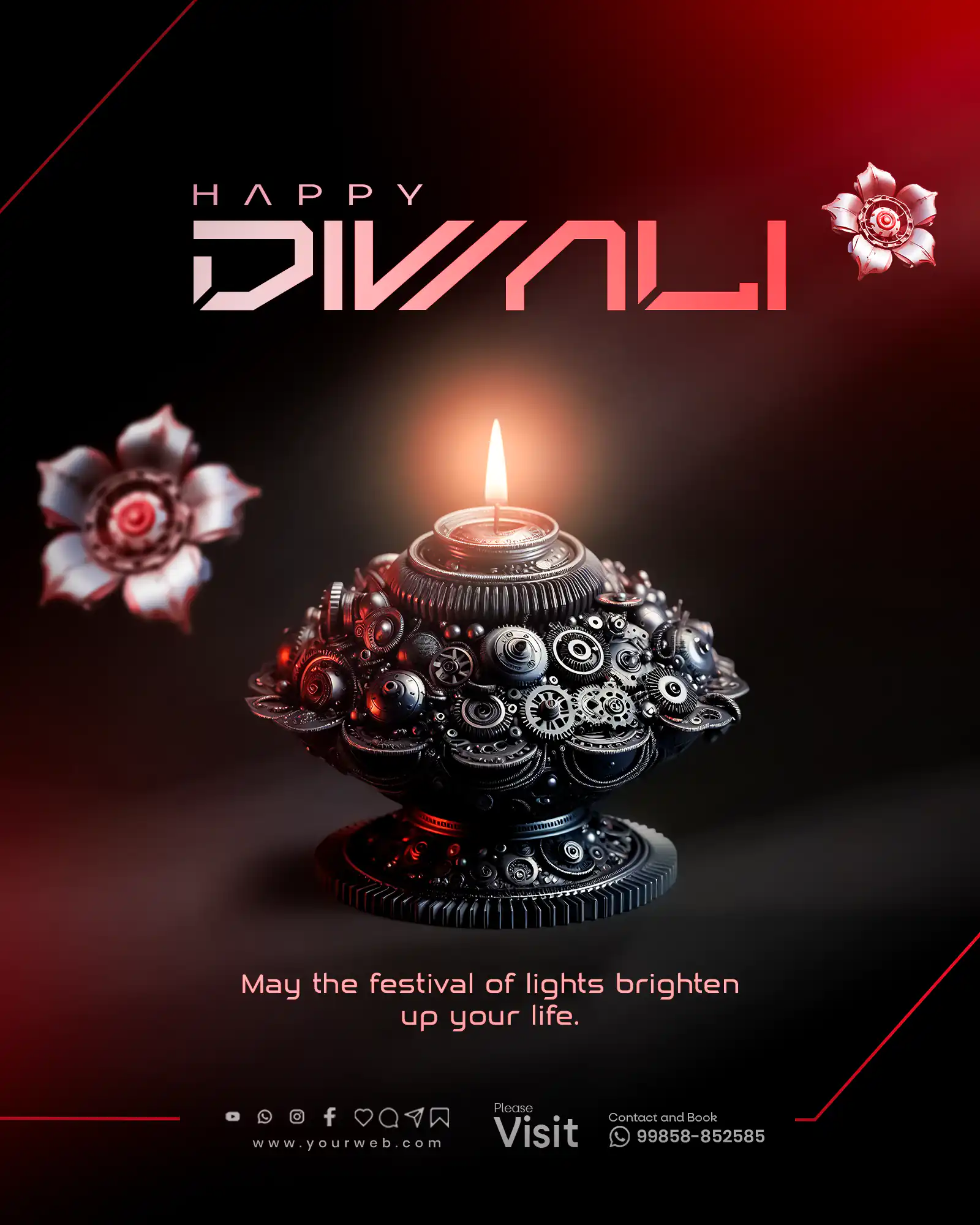Cyberpunk Steampunk Happy Diwali Poster PSD Futuristic Gear Cog Diya Design for Tech and Robotics Brands mechincal auto mobile