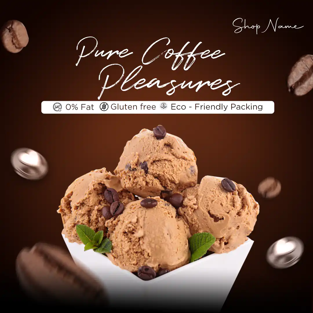 Editable Coffee Ice Cream Layout PSD – Vegan Gluten Free Eco Pack Design With Attractive Illustrations For Food & Dairy Industry Outlets