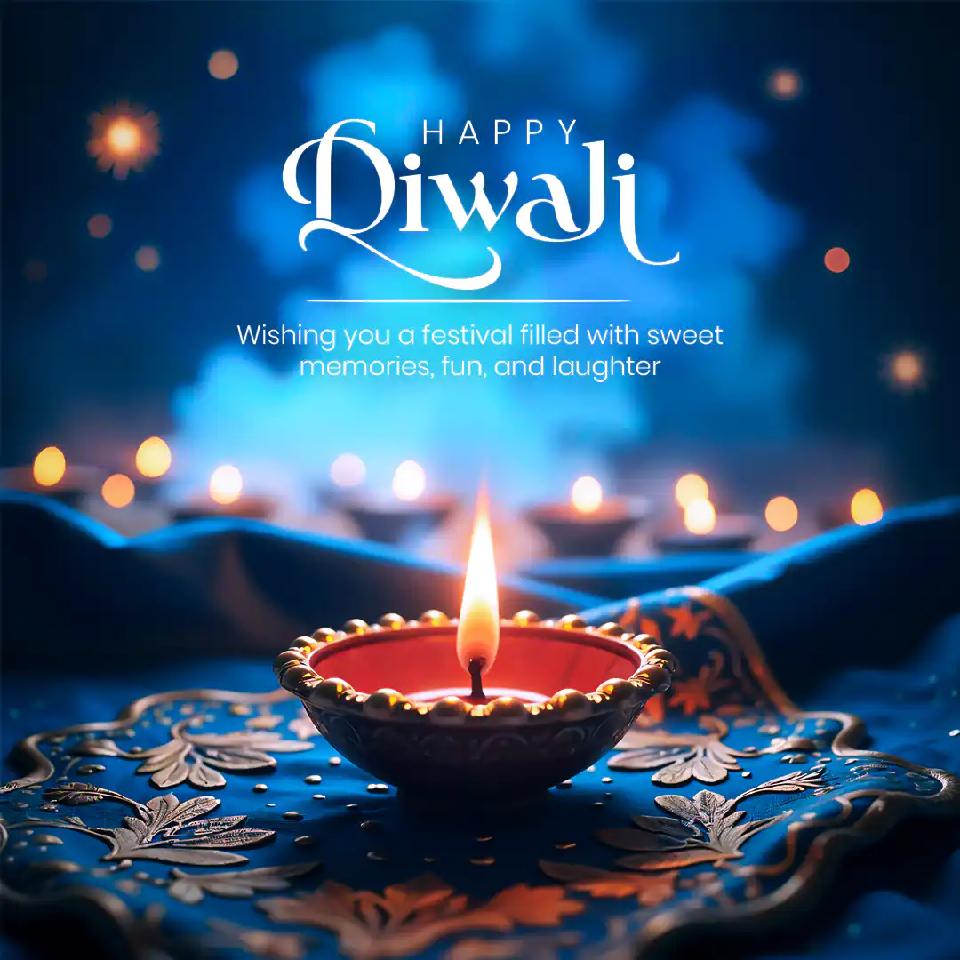 Happy Diwali PSD Template – Close-Up of Lit Diya on Ornate Blue Fabric