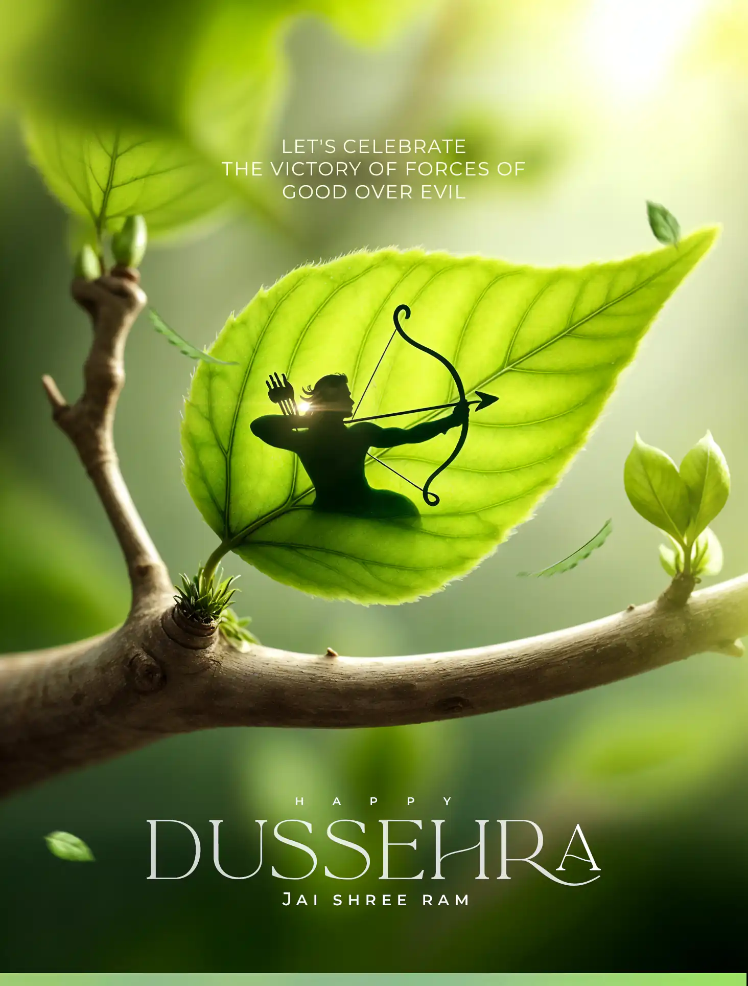 Happy Vijayadashami Dussehra PSD Template – Lord Rama Silhouette on a Glowing Green Leaf